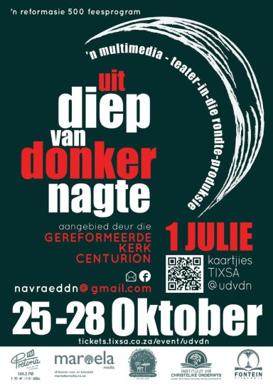 Wie onthou hierdie Hervormingsfeesprogram wat in 2001 by Aardklop opgevoer is? Aanskoulik is hoogtepunte uit die Kerkhervorming uitgebeeld in ’n om vangryke multimedia teater-in-die-rondte pro duk sie. Prof. Jorrie Jordaan was Guido de Bres, prof. Paul Krüger ’n waardige Calvyn met ds. Eric Kayayan se Franse stem. Ds. Christiaan Jooste was die martelaar en ds. Lou Erasmus was Luther.