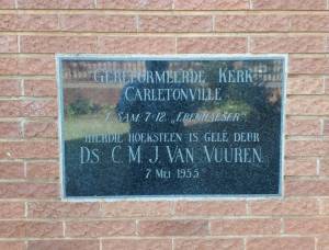 Die hoeksteen van ons gemeente, Gereformeerde Kerk Carletonville, is gelê deur ons eerste predikant, ds. CMJ van Vuuren, op 7 Mei 1955. Die gemeente is gestig vandag, 16 Mei, presies 65 jaar gelede (16 Mei 1953). Mag ons Here Jesus ons genadig wees vir die volgende 65 jaar in Sy diens. Dankie vir al die lidmate wat deur die jare lief was en nog is vir die gemeente, en met opoffering gedien het. Bo alles die lof en die dank aan ons hemelse Vader wat ons in alle tye dra en bewaar.