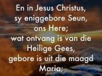 “Ek/Ons glo … in Jesus Christus, sy eniggebore Seun, ons Here; wat ontvang is van die Heilige Gees, gebore uit die maagd Maria …”