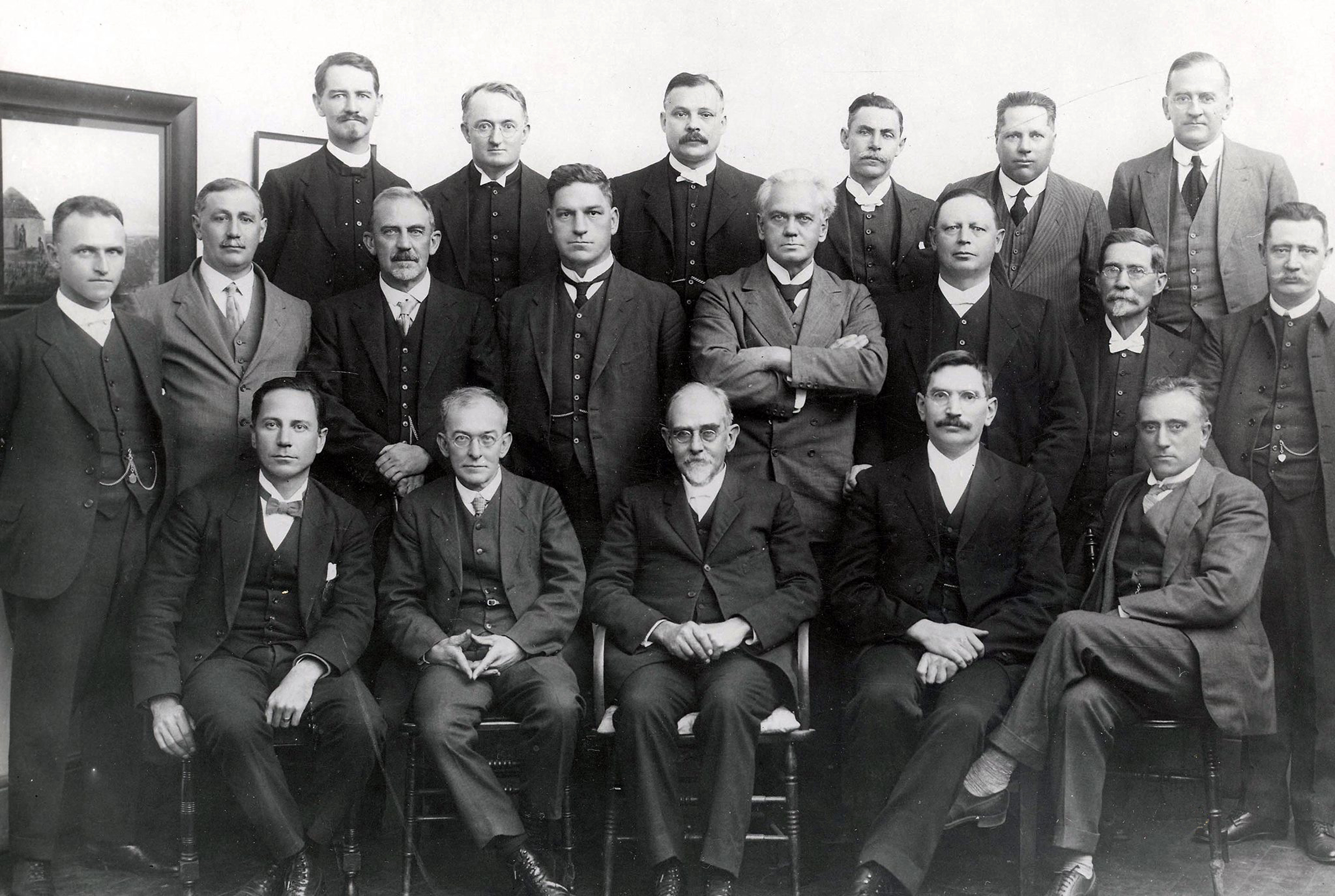 Die adviseurs van die Afrikaanse Bybelvertaling in 1933 in Bloemfontein. Boonste ry: di. J.P.H. Steyn, C.F. Kies, G.D. Malan, W.J.W. Naudé, A.S.E. Yssel, W. de Vos. Middel: Di. C.W.M. du Toit, H.J. Otto, proff. J.A. du Plessis, C.J.H. de Wet, dr. H.D. van Broekhuizen, di. Dirk Postma, P.J.J. Boshoff en H.J. Pienaar. Voor: prof. B.B. Keet, Totius, ds. J.D. Kestell, proff. E.E. van Rooyen en H.C.M. Fourie. Hulle het amptelik bekendgestaan as die Kommissie vir Afrikaanse Bybelvertalers.