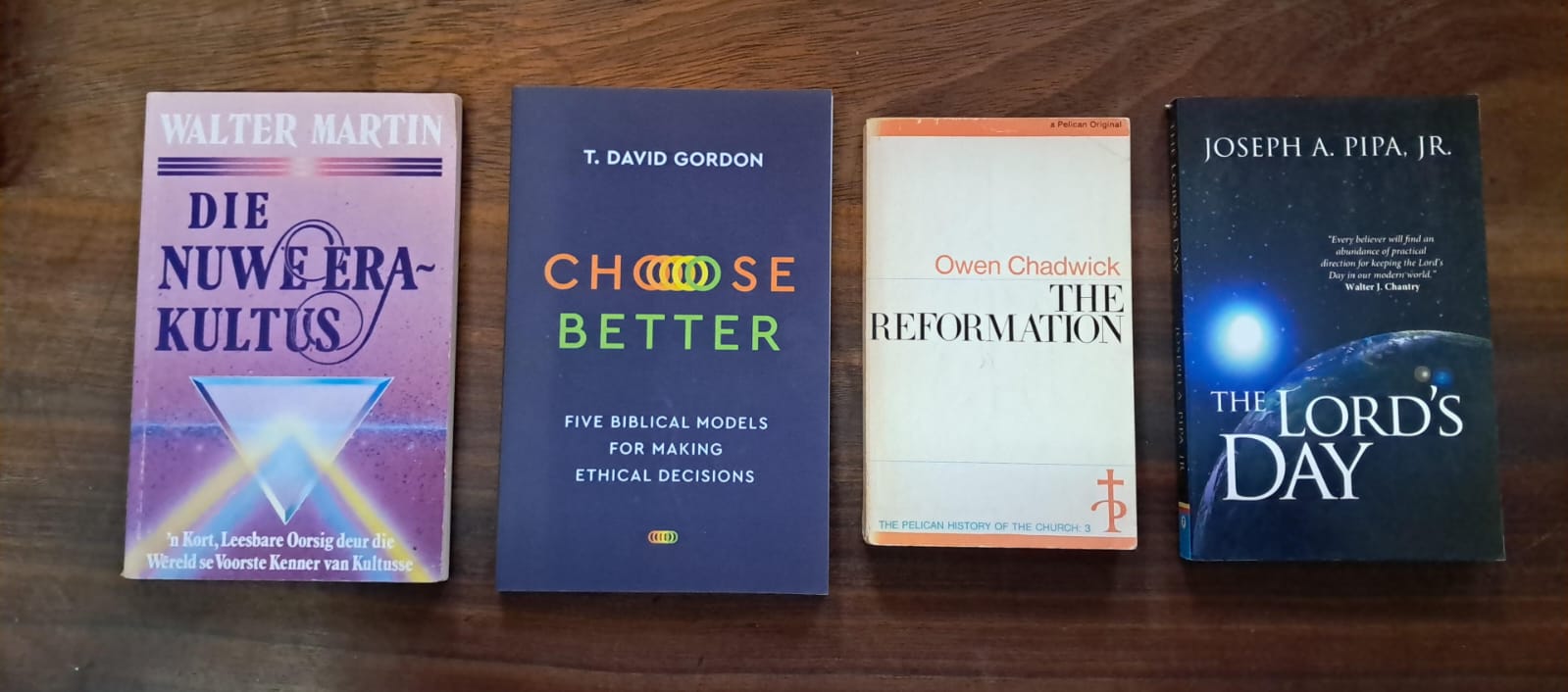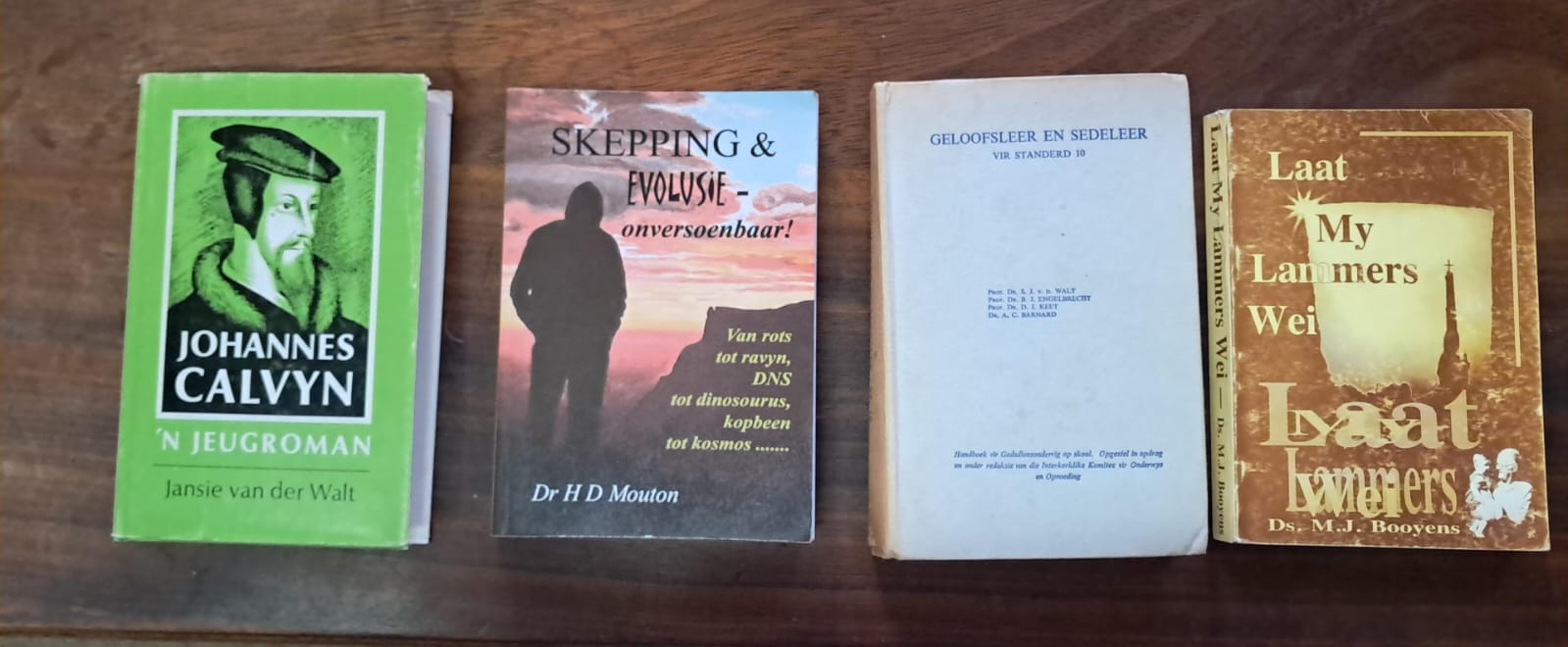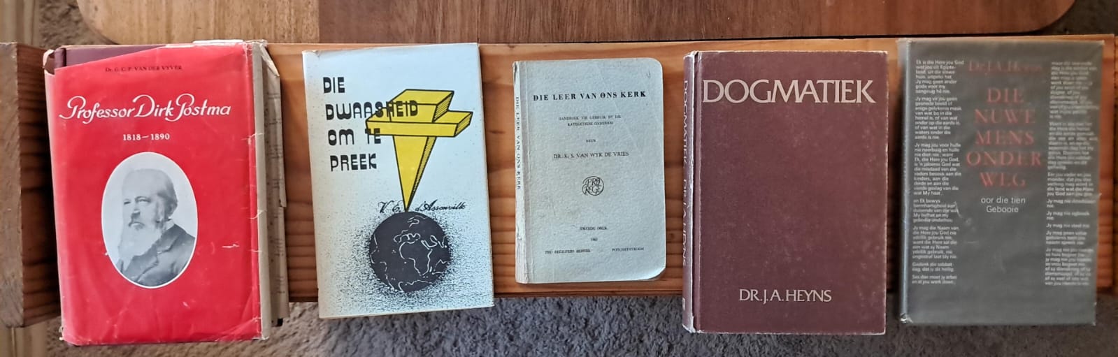 VLNR: Dirk Postma, GCP vd Vyver R90; Dwaasheid om te Preek, VE d’Assonville R40; HK verklaring, Klaas van Wyk de Vries R50; Dogmatiek, JA Heyns R130; Nuwe mens onderweg – tien gebooie verklaring, JA Heyns R50