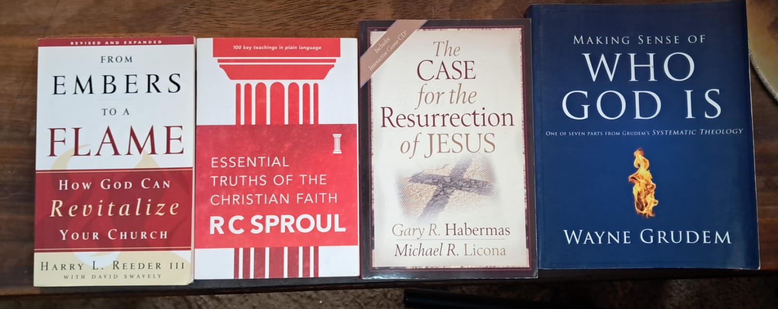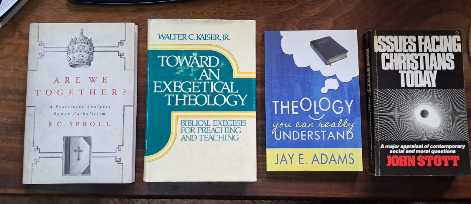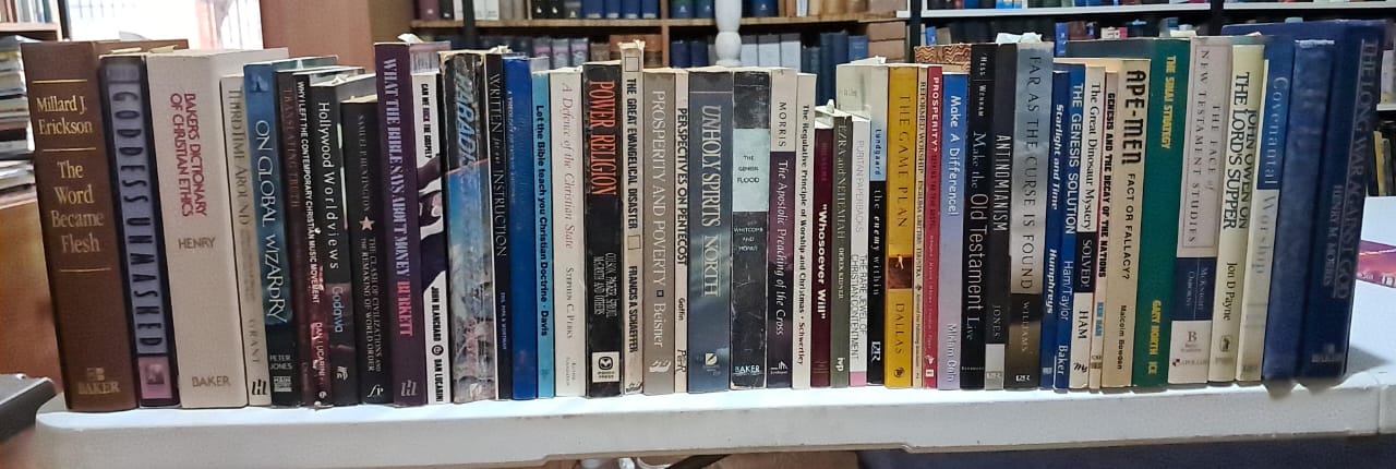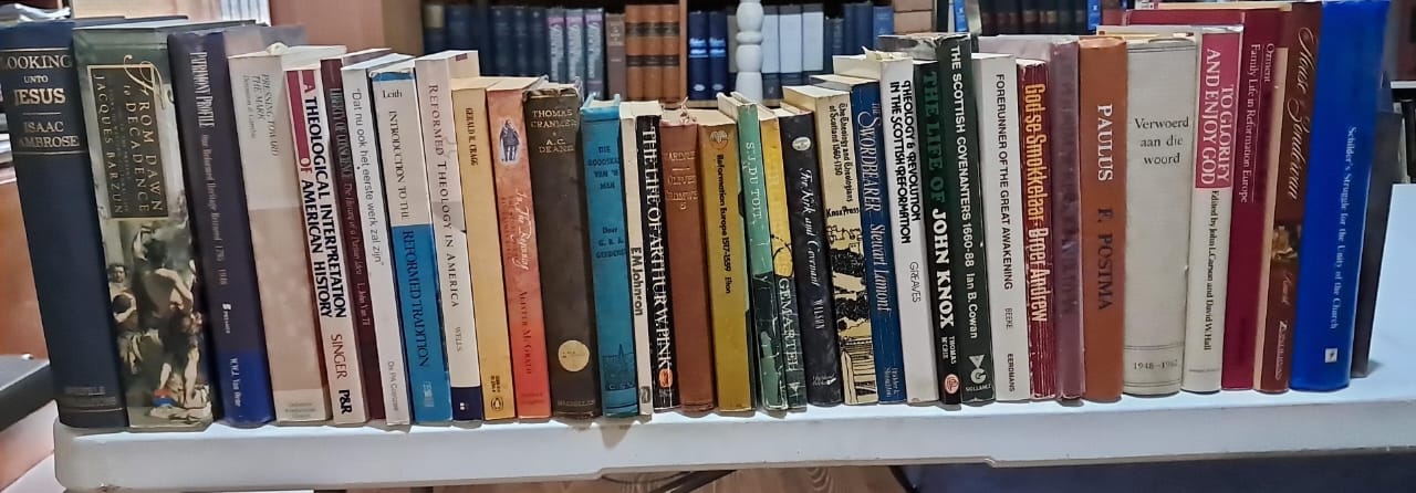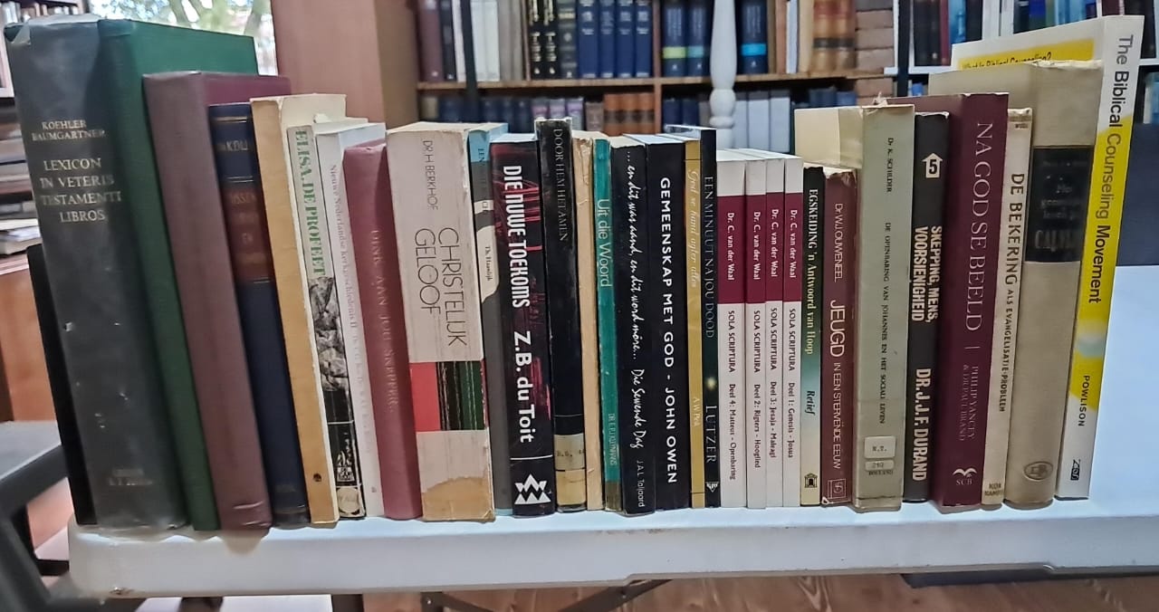 VLNR: R400 vir 4 dele; Oorsprong&Rigting, HG Stoker, 2 dele: R200; History of Christian Doctrines, L. Berkhof, R120; verkoop; verkoop; Meaning of History, H. Berkhof, R100; More than Conquerers (comm. on Revelation), Hendriksen, R100; Gospel of John commentary, R150; Bybelse Ensiklopedie, x2 dele, R200.